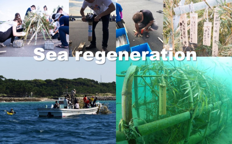 In the past, iron from the mountains flowed into rivers and further into the sea off Fukuoka Prefecture, providing nutrition for lush kelp forests. But over the past few decades, the mountains became desolate and large-scale construction works were carried out along the rivers, disrupting the supply of iron. Combined with global warming raising ocean temperatures, this damaged the kelp forests and dramatically reduced the amount of seaweed in them. Recognizing that the marine environment is a major part of the local ecosystem, the students at Fukuoka Prefectural Suisan Marine Studies High School began thinking about the disorderly proliferation of bamboo in the mountains and the state of the marine ecosystem as a single issue, and started using bamboo to build artificial fishing reefs. They also placed iron-containing rocks on the sea bed. Fish eventually started using these bamboo reefs as spawning grounds, and seaweed began growing on the rocks. Hoping to revive the sea around Munakata, we enlisted the help of the Fukuoka students and are currently building bamboo reefs throughout the area.